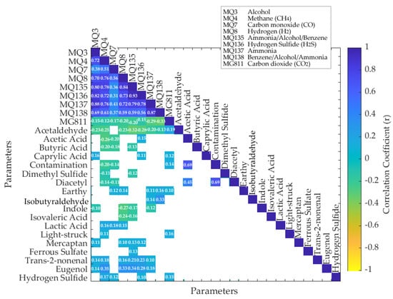 Matrix showing the significant (p < 0.05) correlations between the electronic nose sensors and the beer samples spiked with faults. Color bar represents the positive correlations on the blue side and negative correlations on the yellow side.