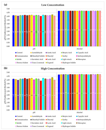 Bar graphs of the pH and alcohol mean values for (a) low and (b) high concentration treatment. Error bars are based on standard error. Different letters depict significant differences (p < 0.05) between samples for each sensor based on the Tukey honest significant difference (HSD) post-hoc test.