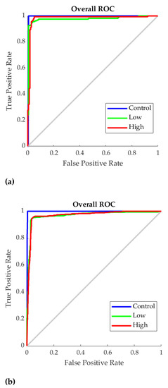 Table 3 shows that both Model 1 (NIR inputs) and Model 2 (e-nose inputs) had high overall accuracy (>95%) to classify the beer samples into control, low and high concentrations of faulty aromas. None of these models was under- or overfitted because their training MSE values were lower than the testing stage, which indicates they gave a high performance. Furthermore, in their receiver operating characteristic (ROC) curves (Figure 7), it can be seen that the three classifications in the two models had very high sensitivity (true positive rate; >0.94). It can be observed that the lowest sensitivity for Models 1 and 2 was the low concentration (0.94 and 0.95, respectively).