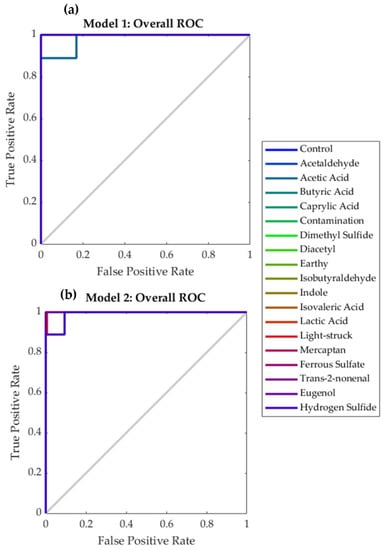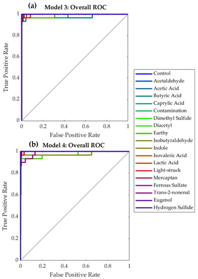 Receiver operating characteristic (ROC) curves of the (a) low (Model 3) and (b) high (Model 4) concentration samples to classify beers according to the faults present in them using the near-infrared absorbance values as inputs.