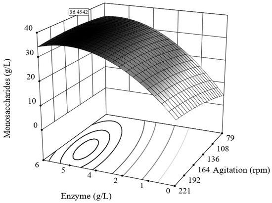 For enzymatic hydrolysis (EnH) of bored coffee beans, the enzyme load (0.17–5.8 g/Lbuffer) and shaking (80–220 rpm) were the factors analyzed. At 5 g/L enzyme load and 100 rpm (Table 3), the highest amount of sugars was obtained (36.4 g/L). ANOVA showed that the load of enzyme was the only significant factor (p-valueenzyme load = 0.0001 and p-valueagitation = 0.1474) at the 95% confidence level. Figure 2 shows the surface response for EnH; increasing the enzyme load resulted in an increased concentration of monosaccharides. At 4.8 g enzyme/L and 163 rpm, the expected response is 36.4 g/L according to the statistical model (Equation (9), R2 = 0.933 and adjusted R2 = 0.886).