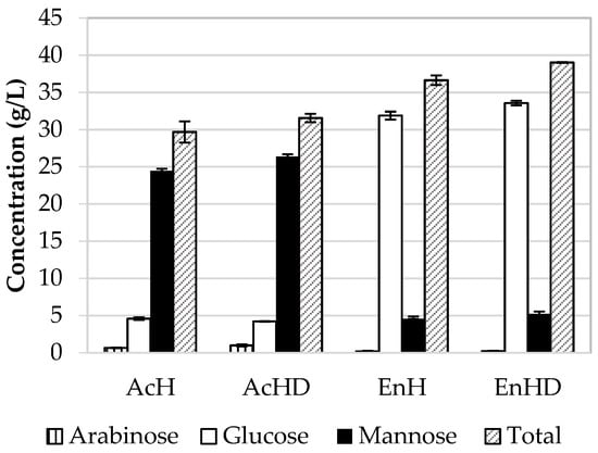 Figure 3 shows the concentration of sugars obtained from the optimal enzymatic hydrolysis (EnH) or acid hydrolysis (AcH) of both acetone-extracted or non-extracted bored coffee beans (EnHD and AcHD, respectively). Mannose, glucose, and arabinose were found. Interestingly, the highest concentration of mannose was found in the samples of acetone-extracted coffee beans subjected to acid hydrolysis (AcHD, 26.4 g/L), whereas glucose was found at only 4.2 g/L and arabinose at about 1 g/L.