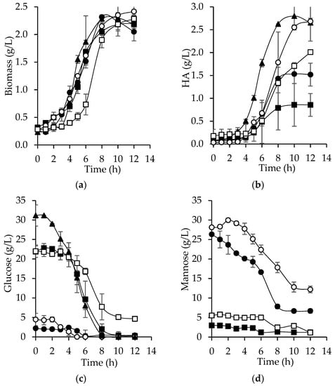 Kinetic profiles for biomass (a), hyaluronic acid (b), glucose (c), mannose (d), and lactic acid (e) from batch fermentation with S. zooepidemicus from hydrolyzates: (●) acid hydrolysis (AcH), (○) acid hydrolysis of extracted bored-coffee beans (AcHD), (■) enzymatic hydrolysis (EnH), (□) enzymatic hydrolysis of extracted bored-coffee beans, and (▲) synthetic medium. Bars represent ± standard deviation (n = 2).