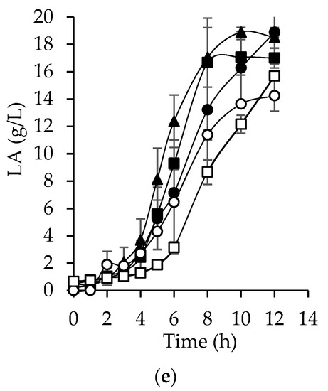 Lactic acid (LA) is a primary metabolite produced simultaneously with HA by S. zooepidemicus. Higher production of LA (Figure 4e), productivity (rLA, Table 5), and specific rate (qLA) were obtained with EnHD (18.8 g/L), slightly higher than those obtained with the synthetic medium (18.6 g/L). However, the concentration of LA with all hydrolyzates was at least 14 g/L and yields (YLA/S) ranged between 0.60 and 0.79 g/g, as seen in Table 5. S. zooepidemicus is a homolactic bacteria that uses the majority of the substrate for LA synthesis [42], which means that bacteria converted from 60% to 80% of the substrate into LA. The LA productivities obtained in this study (1.3 to 1.9 g/L h) agree with values obtained from other microorganisms such as Rhizopus oryzae NRRL 395 and Lactococcus lactis ATCC 19435, whose productivities are 1.62 and 1 g/L h, respectively [43].