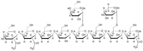 Both the acid and enzymatic hydrolyzates were used for the microbial production of HA. Bacterial growth was similar in all culture media (Figure 4a). The stationary phase was reached at 8 h, except for EnHD. Interestingly, biomass yields (YX/S) were higher with both hydrolyzates compared to the synthetic medium, possibly due to the existence of unidentified substrates. It was expected that the highest concentration of HA would be reached with the enzymatic hydrolyzates because the main substrate in these is glucose. Furthermore, in the enzymatic hydrolysis, compounds such as furfurals and formic acid, which inhibit the bacterial growth, were absent. However, the highest concentration of HA (2.7 g/L) obtained with bored coffee beans hydrolyzates was achieved with AcHD at 12 h (Figure 4b), similar to the amount obtained with the synthetic medium at 8 h (2.8 g/L). This behavior can be explained because there were probably other unidentified substrates in the AcHD that S. zooepidemicus was able to convert into HA. Additionally, a higher concentration of HA was obtained using acetone-extracted bored coffee beans (AcHD and EnHD), achieving 1.8- and 2.3-fold increase in the HA amount, respectively, compared to un-extracted samples, probably because un-extracted bored coffee beans might contain compounds with antimicrobial activity such as quinic, malic, and chlorogenic acids, and caffeine [34]. The main monosaccharide in acid hydrolyzates is mannose; in the enzymatic hydrolyzates, the main sugar is glucose. Glucose originates from the degradation of cellulose, while the lower amount of mannose might be due to the low activity of endogenous mannanase in cellulase preparations from Trichoderma [35], as cellulase from fungi exhibits relatively low levels of galactomannan degradation in softwoods [36]. Mannose originates from galactomannans, which, in green coffee, consist of a linear molecule composed of mannose residues linked by β-1,4 bonds with lateral galactose substituents with α-1,6 linkages, as seen in Figure 5. Other randomly distributed elements were also found such as glucose linked in the main backbone with β-1, 4 bonds, arabinose as a lateral group, and acetyl groups (up to 11%) in mannose [37].