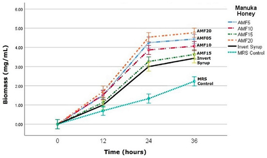 Interestingly, the biomass in all the AMF honey samples was marginally higher than in IS (3.43 mg/mL) after 24 h, but not significantly (p > 0.05) different from each other (AMF 5–20) in all instances. Among the honey samples at the end of the reported fermentation period of 36 h, the biomass was highest in AMF20 at 4.77 mg/mL and lowest in AMF15 at 3.63 mg/mL (p < 0.05). The difference in the biomass in IS (3.43 mg/mL) was not statistically significant (p > 0.05) with AMF15 (3.63 mg/mL) and AMF10 (4.07 mg/mL), but significant (p < 0.05) with AMF5 (4.43 mg/mL) and AMF20 (4.77 mg/mL). Thus, there was no linear pattern observed in the biomass growth depending on the linearly increasing AMF levels. Importantly, this is in broad concurrence with a very recent study on the antibacterial efficacy of varying UMF-grade Manuka honey by Girma et al. [16], which reported no correlation of high UMF (15+) rating with the potency against the pathogens. The researchers had noted that the low UMF (5+) Manuka honey was, within the constraints of the limited sample size in their study, more antibacterially active than the higher grades UMF (10+ and 15+).