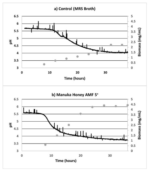 Online parameters indicated the low DO levels (which were less than 0.5%, when 100% was calibrated as the atmospheric oxygen levels), confirming the anaerobic nature of the fermentation process. Growth curves revealed a lag phase of 12 h, after which the pH values started to decline (Figure 3). The addition of further substrate (2.5% w/v) at 24 h resulted in an increased production of organic acids lowering the pH significantly below 4 (up to the 36th hour) only in cases when AMF Manuka honey was the substrate, but not with IS. Moreover, the biomass growth (as also depicted in Figure 1 and Appendix A Figure A1) depleted in the MRS control sample, since a limited substrate was available for bacterial growth. However, the additional substrate in AMF honey and invert syrup resulted in an extended stationary phase of the biomass growth up to 36 h.