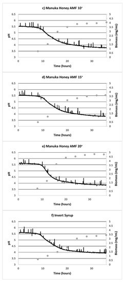 Online pH fermenter curves for L. reuteri DPC16 in fermented MRS broth with (a) unsweetened control, (b–e) AMFTM 5+, 10+, 15+ and 20+ Manuka honey, respectively, and (f) invert syrup as the substrate. Average biomass (mg/mL) is shown in the secondary axis (•). The spikes in pH values were as seen in the anaerobic fermentation set-ups in our laboratory.