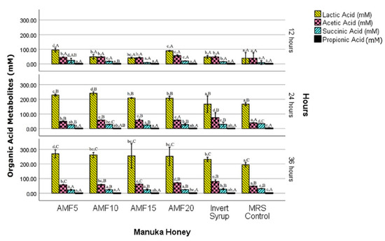 Concentration (mM) of organic acid metabolites in MRS broth with Manuka honey (AMFTM 5+, 10+, 15+ and 20+), invert syrup and unsweetened control during the fermentation period (12, 24 and 36 h). Error bars represent 95% confidence intervals (CI). Different lowercase letters denote significant differences (p < 0.05) among the samples in a row (for that particular organic acid). Different uppercase letters denote significant differences (p < 0.05) among the fermentation periods in a column (for that particular sample).