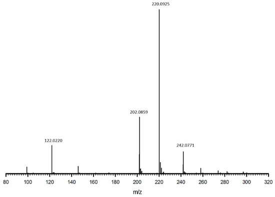 The syntheses of cys-4MMP (also known as (2R)-S-(1,1-dimethyl-3-oxobutyl-cysteine), (R)-2-amino-3-(2-methyl-4-oxo-pentan-2-ylthio) propanoic acid, and S-4-(4-mercapto-4-methylpentan-2-one)-L-cysteine)) and its deuterated analog had been reported [8,24,25]. The structure of cys-4MMP was firstly identified by Tominaga et al. [8] using gas chromatography-mass spectrometry (GC-MS) and further confirmed using 1H and 13C NMR spectroscopy by Starkenmann [24] and Hebditch et al. [25]. However, previous synthesis methods encountered difficulties in separating the desired product from unreacted cysteine or involving 1,4-dioxane, a toxic and unfriendly environmental organic solvent [8,24,25]. Cysteine-conjugates can be obtained by treating cysteine with α,-unsaturated carbonyl compounds under alkaline conditions. To meet the potential requirements of further studies, we used the Michael addition of cysteine to mesityl oxide (2, Scheme 1) (as shown in Section 3.1) to synthesize cys-4MMP and isolated it from the reaction mixture by flash chromatography with normal phase silica gel and a proper solvent system. For chemical structure characterization of cys-4MMP as shown in Figure 1, the base peak at m/z 220 corresponds to the molecular formula C9H17NO3S, the [M + H] ion of 3. In addition to the mass data, the NMR spectrum (Figure 2) closely coincided with the proposed structure revealed in the literature. Compared with other synthetic methods, our method is an environmentally friendly and economical method with a higher yield and potential for large-scale production (Supplementary Table S1). To the best of our knowledge, we are the first to report a pure cys-4MMP (spectrum grade) with a yield of 29.7–35%, evident by the NMR and LC-MS data.