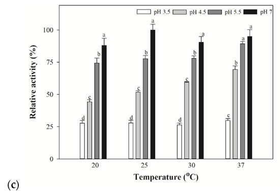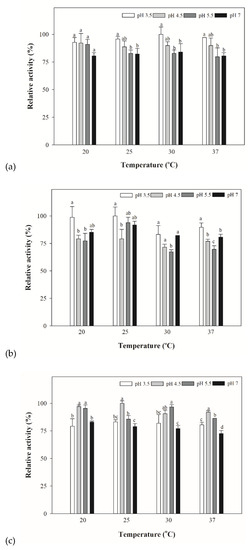 The β-lyase activity of (a) E. limosum, (b) Lb. casei, and (c) S. putrefaciens bacterial extracts at various temperatures and pH. The C-S β-lyase specific activities were determined by the DTNB assay using 1 mM L-cystathionine at 20, 25 30, and 37 °C, and at pH values of 3.5, 4.5, 5.5, and 7.0. Relative activity of 100% represented the highest value among all the specific activity in different temperatures and pH. Data are expressed as mean ± standard deviation (n = 3). Different lower case letters in the same grouped bars indicate significant differences (p < 0.05).