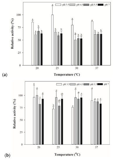 The β-lyase activity of (a) S. cerevisiae 21584, (b) K. lactis, and (c) Schizo. pombe yeast extracts at various temperatures and pH. The C-S β-lyase specific activities were determined by the DTNB assay using 1 mM L-cystathionine at 20, 25 30, and 37 °C, and at pH values of 3.5, 4.5, 5.5, and 7.0. Relative activity of 100% represented the highest value among all the specific activities in different temperatures and pH. Data are expressed as mean ± standard deviation (n = 3). Different lower case letters in the same grouped bars indicate significant differences (p < 0.05).
