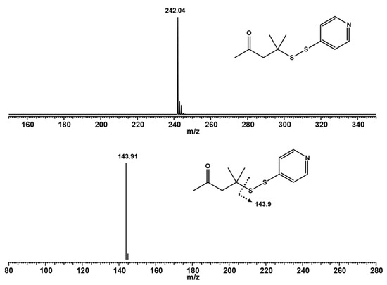 The difficulties in analyzing thiol aroma compounds produced by cell extracts include low product concentration, poor stability, and easy oxidation. Therefore, we used 4,4′-dithiodipyridine (DTDP) to convert 4MMP into a stable derivatized 4MMP-DTDP [32] and then quantified it by LC-MS analysis to determine the product concentration of 4MMP. As shown in Figure 5, 4MMP-DTDP showed an intense peak at m/z 242.04 in the mass spectrum, and a significant fragment signal at m/z 144.0 was observed in the subsequent MS/MS spectrum. Through MS analysis, we confirmed the completeness of the derivatization between DTDP and 4MMP reported by Capone et al. [23] and demonstrated that a characteristic product ion signal was suitable for quantification. The 4MMP-DTDP standard curve determined by monitoring the product ion signal showed a suitable correlation in the range of 1 and 50 ppm, with R2 > 0.99 (Figure S1).
