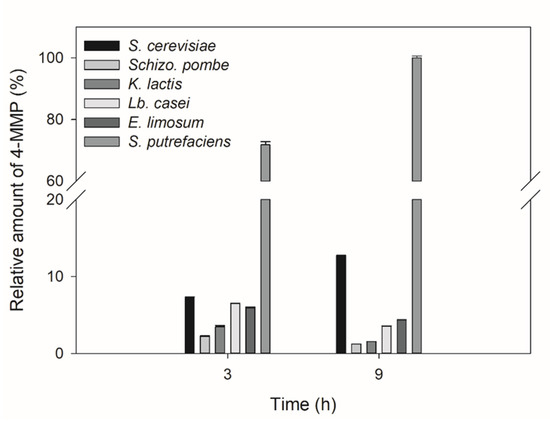 The concentration of 4MMP converted from cys-4MMP by mixing with different cell extracts possessing carbon-sulfur β-lyase from yeasts, such as K. lactis, S. cerevisiae, and Schizo. pombe, and bacteria, such as E. limosum, Lb. casei, and S. putrefaciens, is shown in Figure 6. S. cerevisiae 21584 exhibited the highest conversion efficiency to 4MMP in yeasts, and S. putrefaciens showed the highest conversion rate in all bacterial strains and all six test cell extracts. We believe that this is the first study to compare the ability of yeast and bacterial extracts in converting the 4MMP precursor into the aroma compound 4MMP.