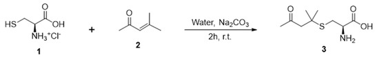L-cysteine hydrochloride 1 (2.81 g, 16 mmole) was dissolved in 10 mL of distilled water, and 16 mL of 1 M Na2CO3 solution was added dropwise to the mixture with stirring to adjust the pH to 8. Then, mesityl oxide 2 (1.57 g, 16 mmole) was added, and the mixture was stirred at room temperature for 2 h. After the reaction mixture was washed with diethyl ether, the aqueous layer was concentrated under vacuum at 40 oC and then subjected to flash column chromatography (eluent: EA/ethanol/distilled water = 4/2/1) to obtain the product cys-4MMP 3. The product was further purified via recrystallization (1.04 g, yield 29%).