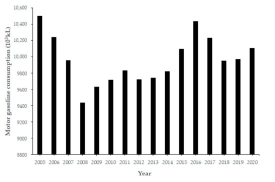 - The ratio of motor gasoline consumption in the transportation sector to domestic gasoline consumption accounted for over 99%. Further, the trend of gasoline fuel consumption in the transportation sector was in accordance with the data on the amounts of registered gasoline motors during the period. For example, the amounts of newly registered passenger cars were 337,886 vehicles in 2015, as compared to 340,349 vehicles in 2020 []. In addition, the significant increase in fuel-efficient cars, diesel passenger cars, hybrid electric cars and electric vehicles in recent years also resulted in the suppression of gasoline motors growth [], suggesting that the consumption of petroleum-based fuels will be on decreasing trend in the near future.