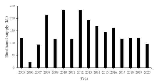 After entering the World Trade Organization (WTO) on 1 January 2002, the production of bioethanol from sugar processing by-products (i.e., molasses) in Taiwan has been temporarily stopped by the Taiwan Sugar Corporation (TSC, one of the state-owned enterprises) since then []. However, the crude oil price has risen by the mid-2000s, becoming an unstable factor for economic development. The Taiwan government was facing pressure to reform the industrial structure and raise energy-saving technologies. Meanwhile, the Kyoto Protocol—put into force on 16 February 2005—pushed the government to mitigate greenhouse gas (GHG) emissions and also develop a renewable energy industry. Although Taiwan is not a signatory to the Protocol, this treaty, which is relevant to the environmental, economic, and energy issues, played a vital role in leading the national development because of its high dependence on imported energy (over 97%) []. A green policy was determined for promoting bioethanol in accordance with the direction concluded by the National Energy Conference in June 2005 []. The bioethanol in the E3 gasohol was supplied by imports in the early stage and mostly supplied by domestic producers in the later stage. In 2007, the MOEA launched the Bioethanol Execution Plan with several development stages, which will be described in Section 3.3. Furthermore, the Petroleum Management Act was subsequently revised in January 2008 to add new clauses concerning the blends of fossil fuels with biofuels at a fixed ratio (i.e., E3 gasohol, as addressed in Section 3.2.1). Figure 2 depicts the variations of bioethanol supply imported during the period of 2007–2020 []. Although the government provided a subsidy of NT$ 1.0–2.0 per liter based on the price of 95-unleaded gasoline, the bioethanol supply has indicated a decreasing demand since 2012.