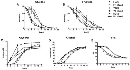 The whole fermentation process was monitored, and the physiochemical parameters (alcohol, glycerol, glucose, fructose, and Brix) were detected (Table S1 and Figure 1). On the whole, the fermentation speed of single-strain groups (FS36, YT28, and HL12) was significantly faster than mixed-strain groups (FS mixed, YT mixed, and HL mixed), which was in agreement with numerous authors [,,,]. Among them, FS36 was the fastest, followed by HL12 and YT28, implying that FS36 had the best fermentation ability. The mixed-strain groups began to ferment rapidly after sequentially inoculated the Saccharomyces yeast strains on the 4th day. On the 19th day, the Brix value of FS36, YT28, and HL12 was 7.7, 7.5, and 7.3, respectively; FS mixed, YT mixed, and HL mixed was 8.0, 7.8, and 7.7, respectively. All groups reached basically the same level and remained stable, indicating that all these Saccharomyces yeasts were well capable of completing alcoholic fermentation, and non-Saccharomyces did not hinder the process.