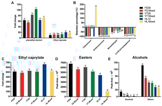 Changes of characteristic aromas in Marselan wine. Different letters indicate the significant differences at p < 0.05. (A,C) The fold change of phenethyl alcohol, ethyl caproate and ethyl caprylate in Marselan wines in comparison of must, respectively; (B) The retention percentage (%) of four varietal aromas in Marselan wines in comparison of must; (D) The peak area of easters of Marselan wines; (E) The peak area of alcohols of Marselan wines.