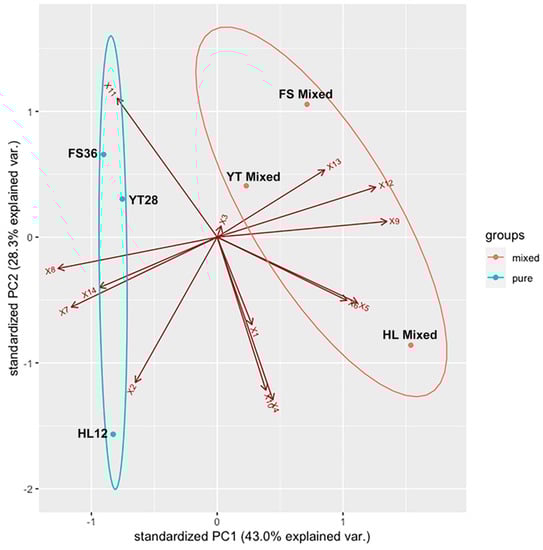 In the PLSR model, 14 key aroma compounds were specified as the X-matrix, and the sensory attributes were specified as the Y-matrix. The correlation loading plot was shown in Figure 5. For the HL12, dried fruits, floral and alcoholic attributes were found to be associated with any of the key aroma compounds: specifically, with ethyl caprylate, β-damascenone, ethyl caproate, and diethyl succinate. For the HL mixed, strong correlations with aroma compounds were found for the citrus attribute. This was consistent with the sensory evaluations that HL mixed had the highest scores for citrus attribute, implying that citrus odor could be the characteristic sensory evaluation for HL mixed. The citrus attribute was correlated with several key aroma compounds, including benzaldehyde, trans-β-farnesol, ethyl propionate, hexyl acetate, and calamenene. For the FS36 and FS mixed, fermentation aromas and berries were the main attributes that correlated with the aroma compounds such as decyl alcohol, 2,4-di-tertbutyl phenol, and phenethyl acetate. For YT28 and YT mixed, both were related to phenethyl alcohol, but there was no related attribute.