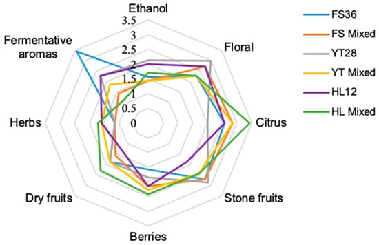 Eight aroma attributes, namely, ethanol, floral, citrus, stone fruits, berries, dry fruits, herbs, and fermentative aromas, contributed to the aroma profile of the wine. Figure 4 demonstrated the mean scores of the sensory attributes of wines. Fermentative, ethanol, and floral attributes, mostly produced during the fermentation process, were the dominating descriptors in single-strain groups. Apparently, HL mixed had the most intense attributes of citrus, herbs, berries, and dry fruits, implying that HL mixed group had a stronger and more complicated aroma profile than other groups. FS36 has the strongest fermentative flavor but a weaker perception of other attributes. On the whole, mixed-strain groups showed stronger notes of citrus, berries, and herbs, of which HL mixed had the highest scores in both terms. Thus, HL mixed showed the most promising potential to preserve Marselan varietal and also the richest sensation among all groups.