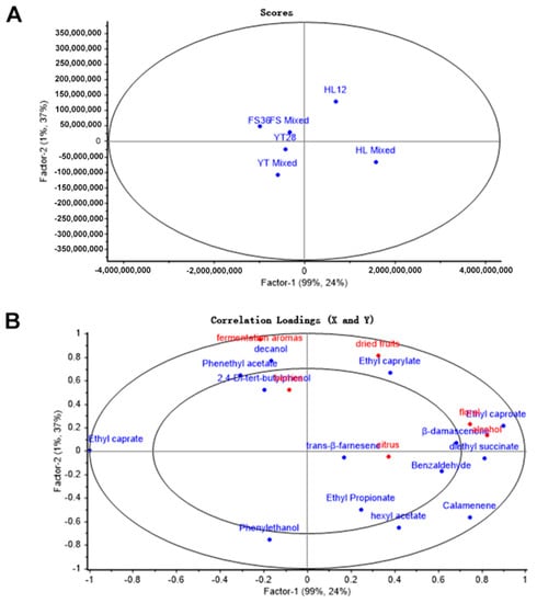Partial least square regression correlation plot for six Marselan wines. The model was established by 14 key aroma compounds of GC-MS measurements as X, Y for the flavor attributes. (A) Scores of samples; (B) correlation loadings of X and Y.