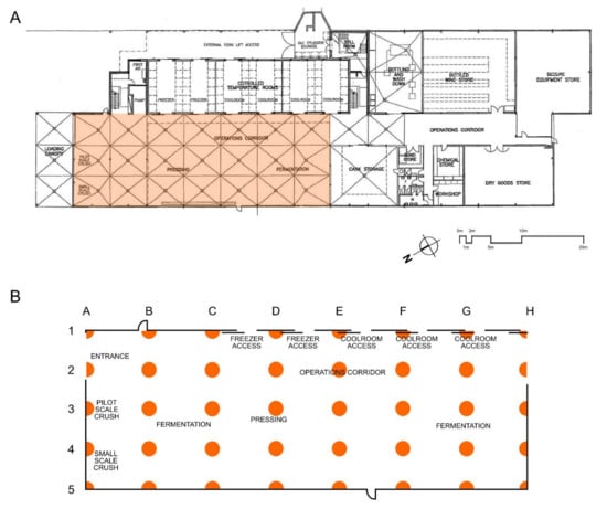 Sampling locations at the Hickinbotham Roseworthy Wine Science Laboratory (HRWSL). (A) Swab samples were taken from the floor of the main HRWSL operations/fermentation area (orange shade). (B) Samples were taken in a 5 × 8 grid pattern at three different time points, before vintage (December 2019), during vintage (March 2020) and after vintage (June 2020).