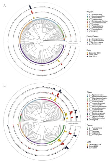 Microbial communities found in the Hickinbotham Roseworthy Wine Science Laboratory (HRWSL). Cladograms shows different taxonomy levels in concentric rings. From the centre, kingdom, phylum, class, order, family and genus are shown. (A) Bacterial communities with all identified phyla coloured, relative abundance for final taxonomies indicated in outer rings. (B) Fungal communities with all identified classes coloured, relative abundance for genera indicated in outer rings.