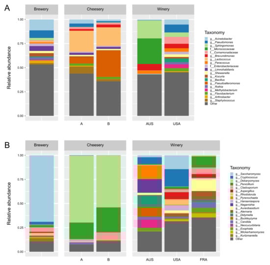 Microbial composition for the top 20 most abundant terminal taxonomies in different food and beverage facilities. (A) Bacterial community structure and (B) fungal community structure. Facilities include a brewery, two cheese making facilities (A,B) and three wineries located in different countries, Australia, USA and France.