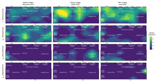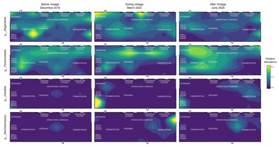 Mapping of the most abundant bacterial taxonomies to the winery floor plan is shown in Figure 4. The family Micrococcaceae was found in most locations in the winery operations area before, during and after vintage. Relative abundance increased considerably during vintage, particularly close to the entrance and on the operations corridor, and remained relatively high after vintage. The genus Sphingomonas was well distributed across the winery before vintage with high abundance in the pilot scale crush and pressing areas (Figure 4). Sphingomonas relative abundance and winery area coverage decreased during and after vintage, to be found mainly close to the winery walls. The genus Brevundimonas was only found in the small-scale crush area before vintage. Increased abundance was found during vintage in one of the fermentation areas, and in the pressing and on the second fermentation areas. Relative abundance for Brevundimonas decreased after vintage in all these areas (Figure 4). The genus Exigiobacterium was only found after vintage, mainly on the right wall of the winery showing very high abundance (Figure 4).