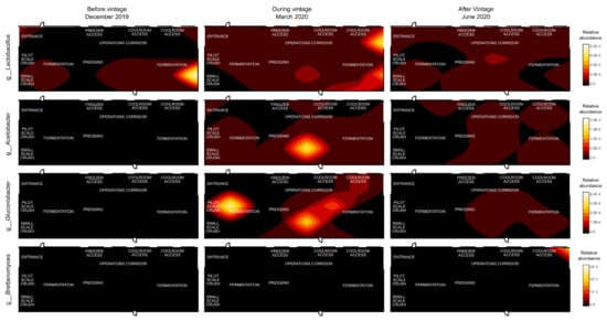 Wine spoilage microorganisms, including the genera Lactobacillus, Acetobacter, Gluconobacter and Brettanomyces showed very low relative abundance when mapped to the winery floor plan (Figure 6). Lactobacillus was the only spoilage microorganism found before vintage. All three spoilage bacteria, Lactobacillus, Acetobacter and Gluconobacter, showed increased abundance during vintage with each microorganism associated with different areas (Figure 6). Relative abundance for all three spoilage bacteria decreased noticeably after vintage. Brettanomyces was only found after vintage in the top right corner of the winery (Figure 6).