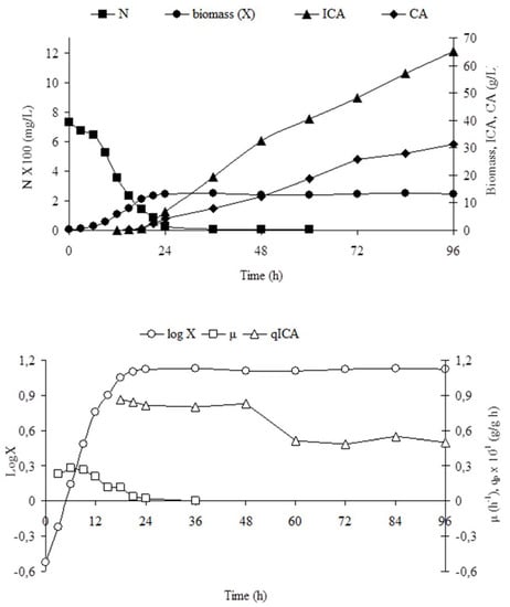 The calculation of production parameters, such as the product yield (YICA), the specific growth rate (µ), the specific rate of ICA synthesis (qICA), and volume productivity (QICA), have been described earlier [,].