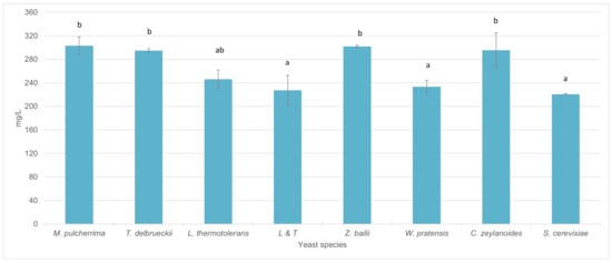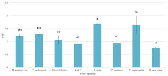 - Belda, I.; Ruiz, J.; Beisert, B.; Navascués, E.; Marquina, D.; Calderón, F.; Rauhut, D.; Benito, S.; Santos, A. Influence of Torulaspora delbrueckii in varietal thiol (3-SH and 4-MSP) release in wine sequential fermentations. Int. J. Food Microbiol. 2017, 257, 183–191. [Google Scholar] [CrossRef]