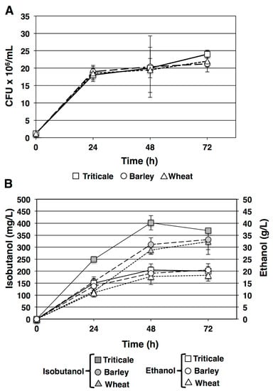 In this study triticale, wheat and barley proved to be effective as feedstock for the co-production of isobutanol and ethanol and give similar yields of the final products. Triticale may hold an advantage as feedstock for biofuel or chemical production, it is high yielding, hardy, drought tolerant and capable of growth on marginal lands that will not support wheat or barley []. Triticale also requires less nitrogen fertilizer than wheat []. This is an important consideration in both cost of production and the fact that nitrogen fertilizer accounts for 70% of the carbon footprint of grain production [,]. Triticale is not extensively used as a human food, rather its largest market is for use as animal feed []. Thus, triticale may be an excellent candidate feedstock for biofuel or chemical production.