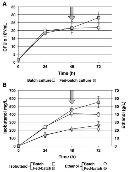 SSF in batch (open symbols) and fed-batch (filled symbols) fermentations of triticale starch. (A) Viable yeast cell counts at each time point determined by CFU. Data shown are mean values from triplicate platings. Error bars indicate standard deviation. (B) Isobutanol concentration in mg/L in fermentation reactions (square symbols), ethanol concentration in g/L in the fermentation reactions (circles), batch fermentation values are shown in the open symbols and fed-batch in filled symbols. The vertical arrow indicates the time of the starch feed addition. Values displayed are the means of triplicate cultures. Error bars indicate standard deviations.