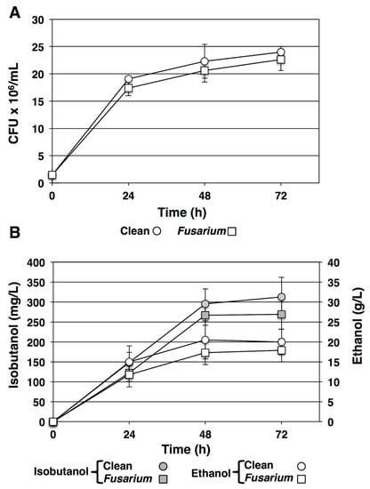 SSF of uninfected (Clean, circles) and F. graminearum infected (Fusarium, squares) barley. (A). Viable yeast cell counts at each time point from fermentation of clean barley starch feedstock (circles) or barley starch prepared from barley experimentally infected with F. graminearum (squares) by CFU. Data shown are mean values from triplicate platings. Error bars indicate standard deviation. (B) Isobutanol concentration in mg/L (filled symbols) and ethanol concentration in g/L (open symbols) was measured in fermentation reactions fed with clean barley starch (circles) or F. graminearum-infected barley starch (squares). Values displayed are the means of triplicate measures. Error bars indicate standard deviations.