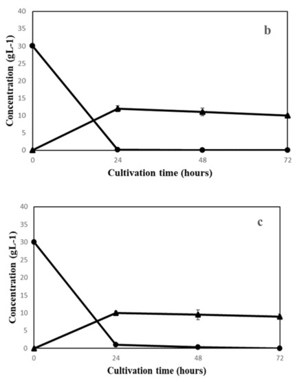 Sugar utilization and ethanol production of (a) A. oryzae (pH = 6.5), (b) N. intermedia (pH = 5.5) and (c) R. oryzae (pH = 5). (glucose (●) and ethanol (▲)).