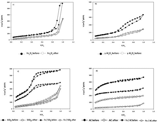 N2 adsorption–desorption isotherms for support before and after the batch dark fermentation: (a) Fe2O3; (b) γ-Al2O3; (c) SiO2 and Fe/SiO2; (d) AC and Fe/AC.