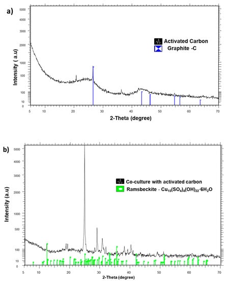 After the dark fermentation, the XRD profile of the activated carbon support (Figure 2b) shows the crystallographic phases of the Ramsbeckite (JCDPS 39-0365). This copper species probably comes from the adsorption of metal species such as copper in the culture medium.