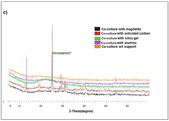 Powder XRD patterns: (a) AC before dark fermentation; (b) AC after dark fermentation; and (c) all supports after dark fermentation.