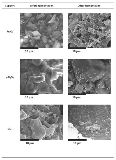The surfaces of the immobilized cells were studied by scanning electron microscopy (SEM). The number of bacteria attached was counted using ImageJ 1.46 r software, MD, USA. Figure 3 shows the random distribution of cells on each support. The number of attached bacteria is higher after fermentation; however, alumina shows the lowest density. The support surfaces look different showing distinct images of bacterial attachments.