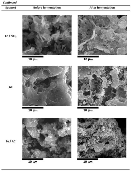 The textural characteristics of each support used for dark fermentation are summarized in Table 1. The N2 physisorption of the carrier was performed before and after the dark fermentation.