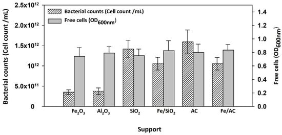 As can be observed, Figure 4 presents the attached cell counts of mixed cultures. It shows that the cell population improves in the following order: AC > SiO2 > Fe/AC ≥ Fe/SiO2 > γ-Al2O3 > Fe2O3. This might be due to the surface area and roughness. There was a qualitative increase in the number of attached cells on the AC than the other supports. Attached cells or biofilms are defined as matrix-enclosed bacterial populations, which adhere to each other and the support surfaces []. Biofilm-attached bacteria predominate numerically and metabolically in virtually all ecosystems []. Costerton et al. [] reported that the substratum structure promotes the attachment of bacteria to the surface, and there is considerable evidence that attachment increases with increasing surface roughness or rugosity of the support. Other factors, such as the coating of the substratum with biomolecules, e.g., proteins and polysaccharides, and the hydrodynamic flow velocity immediately adjacent to the substratum, also influence biofilm formation. In addition, cellular properties of bacteria such as the presence of fimbriae and flagella, and the production of extracellular polymers increase bacteria attachment [,]. Indeed, the sugar analysis of exopolysacharides isolated from Citrobacter freundii showed the presence of mannose and glucose []. The concentrations of nutrients in the aqueous medium surrounding the attached cell also affect biofilm development.
