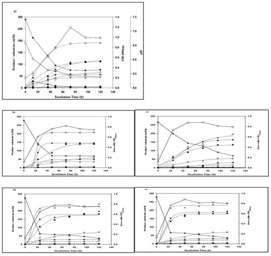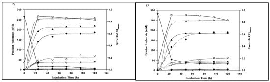 Maximum specific production or consumption (qmax,i) were calculated using the values obtained from the data fits (Equations (2) and (3)), according to Equations (5) and (6) respectively, and the ratio of the maximum production rate or substrate consumption rate to the maximum dry cell weight (DCWmax).