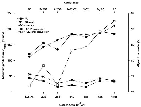 - Maximum lactate production (mmol/L) and yield (mol lactate/mol glycerol consumed) increased in the following order: γ-Al2O3 < SiO2 < AC < Fe/SiO2 < Fe/AC < Fe2O3 < FC.
