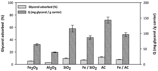 In our reference experiments (only support), it was observed that H2 or other metabolites were not produced without the culture. Due to adsorption, however, glycerol decreased over time. Figure 7 shows the capacity of each support to adsorb glycerol, calculated from the change in glycerol concentration in the solution according to Equation (1). As can be seen, the maximum amount of glycerol adsorbed is 150 mg/g of AC. Some reports on phenol adsorption tests also show a maximum capacity of 370 mg ph/gAC at 20 °C for the same active carbon support [].