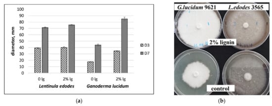 Diameter of mycelia grown on MEB agar and MEB + 2% CS lignin (lg). Experiments were performed in triplicate. (a) D3, D7–days of cultivation. (b) L. edodes and G. lucidum mycelial growth on solid media, cultivation period—10 days.