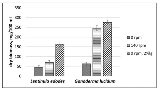L. edodes and G. lucidum revealed a significantly higher yield (p < 0.01) when grown on medium with CS lignin. Surface liquid cultivation without agitation of both mushrooms resulted in 3- to 5-fold higher mycelial biomass yield when supplemented with CS lignin (Figure 2).