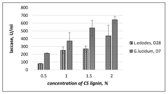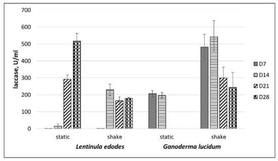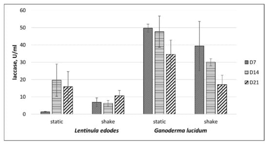 As shown in Figure 5, fermentation under agitation at 140 rpm resulted in a significant increase in laccase activity of G. lucidum when compared to static fermentation. The maximum laccase activities were detected during the first 14 days of G. lucidum cultivation with agitation. In the case of G. lucidum, laccase activity was seen with a peak of approximately 540 U/mL at day 14 with a decrease at day 21. Thus, the presence of CS lignin in the cultivation media significantly increased laccase activity in submerged cultures. As can be seen from Figure 4 and Figure 5, extracellular laccase activity, measured in the supernatants after cultivation with CS lignin additive, was 35- to 40-fold higher for L. edodes and 10- to 15- fold higher for G. lucidum than in supernatants without lignin.