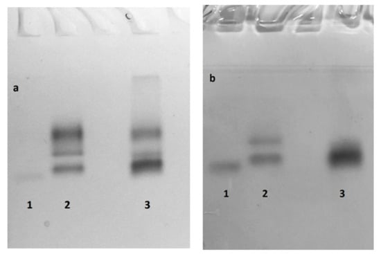 Zymogram of ligninolytic enzymes from G. lucidum culture medium at 14 days of cultivation. The gel was stained: with ABTS (a), and with TMPD (b). Lanes: 1—SL cultivation without agitation; 2—SM cultivation with agitation with 2% CS lignin supplement; and 3—SL cultivation without agitation with 2% CS lignin supplement.